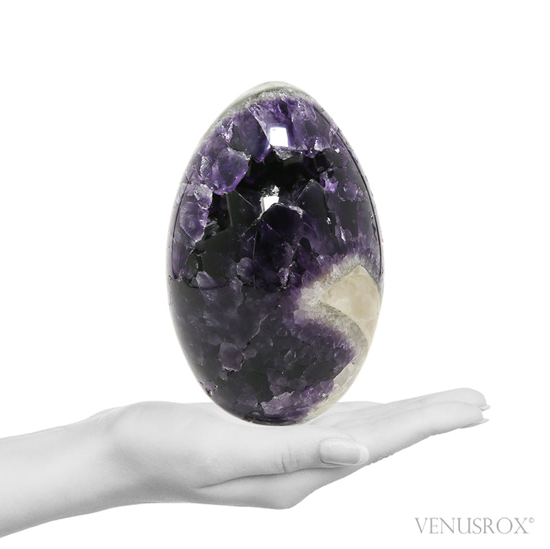 A stunning Amethyst with Calcite & Moss Agate Geode Egg from Brazil